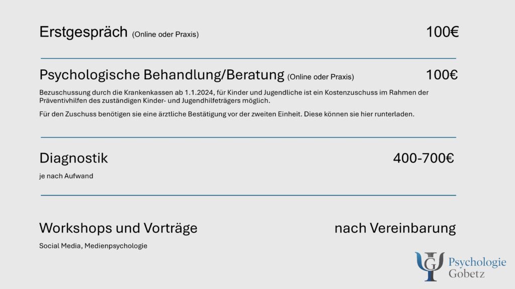 Seit 01.01.2024 ist bei Vorliegen der entsprechenden Voraussetzungen eine Bezuschussung durch die Krankenkasse möglich. Zusätzlich kann in manchen Fällen eine (teilweise) Kostenübernahme durch Zusatzversicherungen oder andere Stellen erfolgen. Gerne klären wir die individuellen Möglichkeiten gemeinsam im Rahmen des Erstgesprächs.