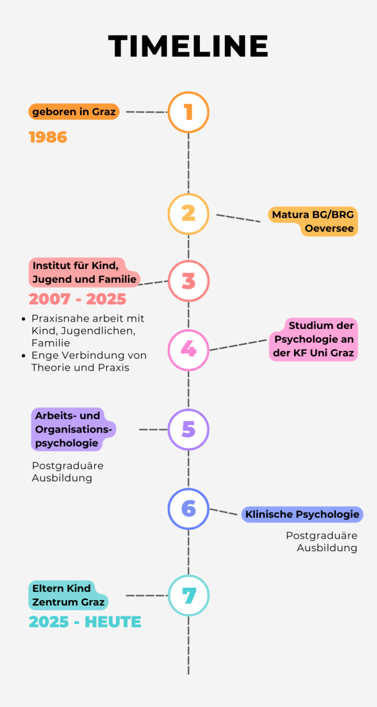 Nach der Matura am BG/BRG Oeversee studierte ich Psychologie an der Karl-Franzens-Universität Graz. Bereits während des Studiums war mir die enge Verbindung von Theorie und Praxis besonders wichtig.